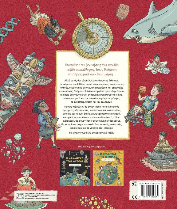 Αλλά αυτός δεν είναι ένας συνηθισμένος άτλαντας. Οι «χάρτες» του βιβλίου αυτού είναι υπέροχες, ευφάνταστες σκηνές, γεμάτες από απίστευτες εφευρέσεις και σπουδαίες ανακαλύψεις. Υπάρχουν δώδεκα κεφάλαια προς εξερεύνηση, τα οποία δείχνουν πώς οι άνθρωποι ανακάλυψαν τα πάντα, από την ιατρική και την τεχνολογία μέχρι τα τρόφιμα, το Διάστημα, ακόμη και τον αθλητισμό. Καθώς ταξιδεύεις, θα συναντήσεις καταπληκτικούς εφευρέτες, εξερευνητές, καλλιτέχνες και αστροναύτες από όλο τον κόσμο. Θα δεις πώς εφευρέθηκε η γραφή, η ιατρική, τα αυτοκίνητα και η σοκολάτα (και ό,τι άλλο ενδιάμεσα). Θα συναντήσεις ρομπότ και δεινόσαυρους. Θα εντοπίσεις μικροσκοπικούς διαστημικούς ανιχνευτές, αρχαίο τυρί και το ναυάγιο του Τιτανικού. Θα είναι σίγουρα ένα συναρπαστικό ταξίδι!