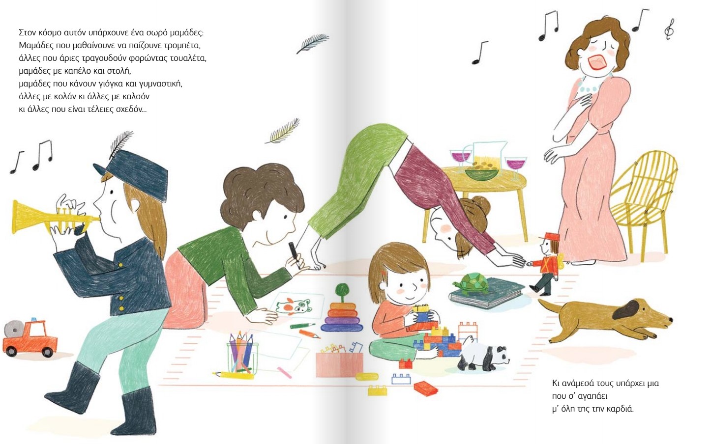 Μαμάδες που μαθαίνουνε να παίζουνε τρομπέτα, άλλες που άριες τραγουδούν φορώντας τουαλέτα, μαμάδες με καπέλο και στολή, μαμάδες που κάνουν γιόγκα και γυμναστική, άλλες με κολάν κι άλλες με καλσόν κι άλλες που είναι τέλειες σχεδόν…