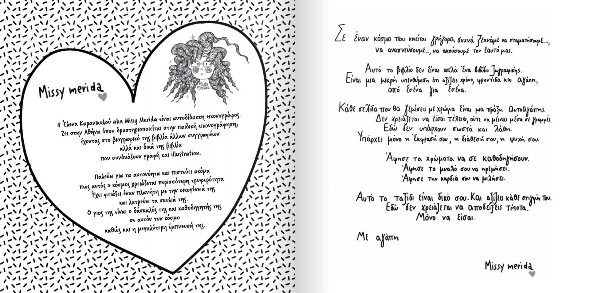 Αυτό το βιβλίο δεν είναι απλώς ένα βιβλίο ζωγραφικής. Είναι μια μικρή υπενθύμιση ότι αξίζεις χρόνο, φροντίδα και αγάπη, από εσένα για εσένα.