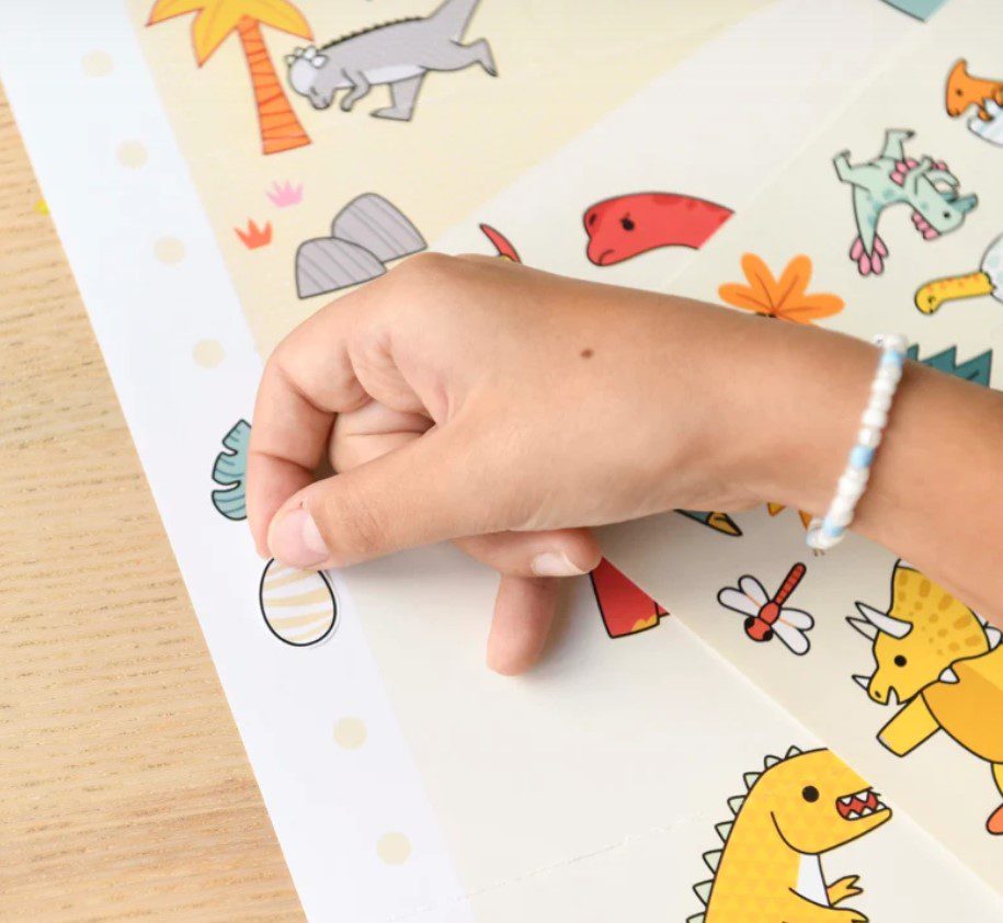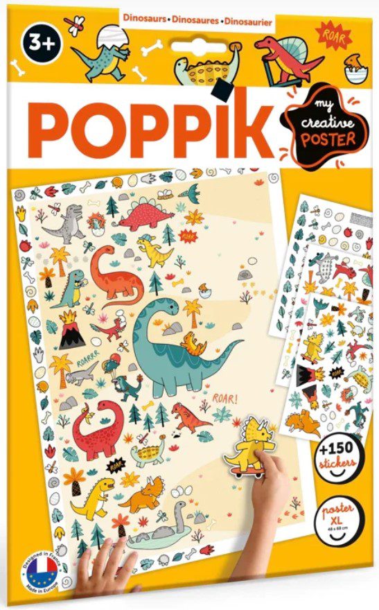 Το παιδί ξεδιπλώνει την αφίσα και κολλάει πάνω τους αστείους δεινόσαυρους, ενώ εφευρίσκει τις δικές του ιστορίες. Τα αυτοκόλλητα είναι ημι-επανατοποθετημένα, ώστε να μπορούν να αντικατασταθούν μία ή δύο φορές. Εάν είναι απαραίτητο, παρέχεται ένα παράδειγμα στο πακέτο. Μόλις ολοκληρωθεί, αυτή η υπέροχη αφίσα θα μπορεί να διακοσμήσει το δωμάτιο!