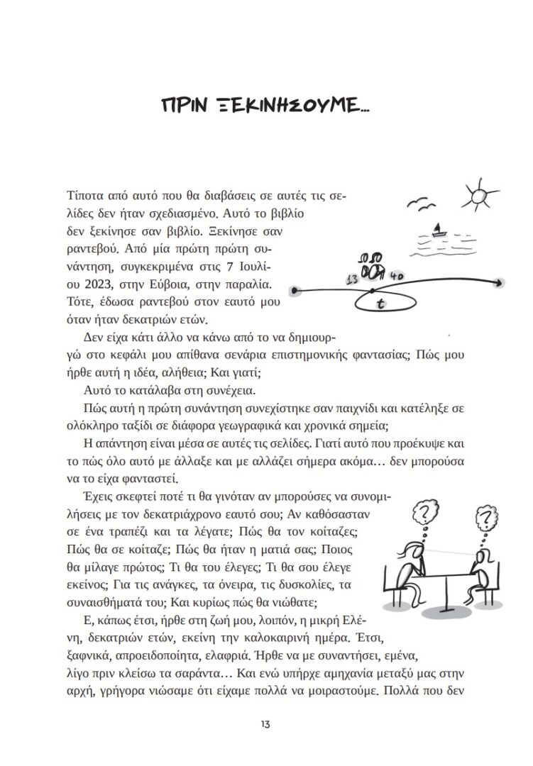 Όπως κατάλαβες, το βιβλίο που κρατάς είναι κάπως… ιδιαίτερο. Μπορεί να σε ταρακουνήσει, να σε συγκινήσει, αλλά και να σε προσκαλέσει να αγαπήσεις τον εαυτό σου λίγο παραπάνω. Θα τολμούσες να βγεις ραντεβού με τον 13χρονο εαυτό σου; Πώς θα ένιωθες; Πώς θα τον κοίταζες; Τι θα του έλεγες; Εκείνος, πάντως, σε περιμένει… Έχει πολλά να σου πει…