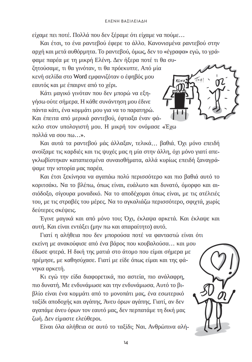 – Ναι, αλλά δικό μας είναι το βιβλίο! Εσύ είσαι η πρωταγωνίστρια. Το εσωτερικό μου παιδί. Η 13χρονη που ψάχνει τον εαυτό της, το νόημα…που μεγαλώνει μέσα στις σελίδες…