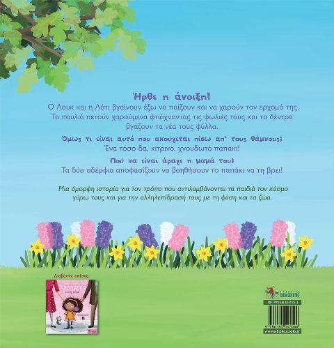 Ήρθε η άνοιξη! Ο Λουκ και η Λότι βγαίνουν έξω να παίξουν και να χαρούν τον ερχομό της. Τα πουλιά πετούν χαρούμενα φτιάχνοντας τις φωλιές τους και τα δέντρα βγάζουν τα νέα τους φύλλα. Όμως τι είναι αυτό που ακούγεται πίσω από τους θάμνους; Ένα τόσο δα, κίτρινο, χνουδωτό παπάκι! Πού να είναι άραγε η μαμά του; Τα δύο αδέρφια αποφασίζουν να βοηθήσουν το παπάκι να τη βρει! Μια όμορφη ιστορία για τον τρόπο που αντιλαμβάνονται τα παιδιά τον κόσμο γύρω τους και για την αλληλεπίδρασή τους με τη φύση και τα ζώα.