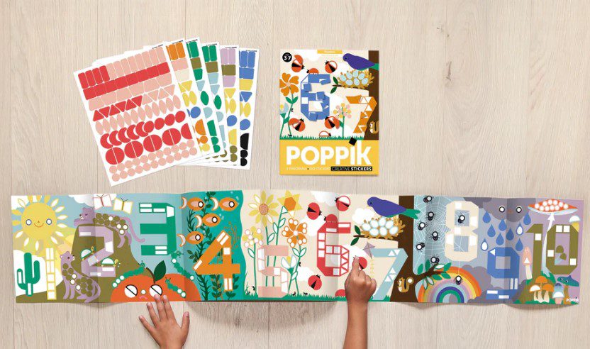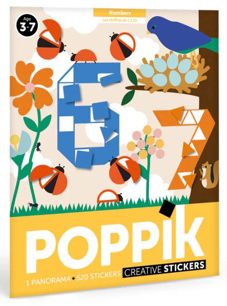 Ένα μεγάλο πόστερ και 520 μοναδικά αυτοκόλλητα από τη γαλλική εταιρεία Poppik. Ένας πολύ δημιουργικός τρόπος για να μάθει το παιδί να μετράει ως το 10. Κάθε νούμερο συνδέεται και με ένα στοιχείο της φύσης, κάποιο ζώο ή φυτό. Το παιδί κολλάει τα σωστά σχήματα στο σωστό σημείο ακολουθώντας έναν χρωματικό κώδικα και συνθέτει την μια πολύχρωμη εικόνα φυσικού τοπίου. Είναι κατασκευασμένο στη Πολωνία από την Beci Orpin για την εταιρεία Poppik. Αυτή η δραστηριότητα έχει κατασκευαστεί για παιδιά 3-6 ετών. Ενισχύει την ικανότητα αναγνώρισης χρωμάτων και σχημάτων και τη λεπτή κινητικότητα. Τα αυτοκόλλητα μπορούν να κολληθούν και να επανακολληθούν για ατελείωτο παιχνίδι. Είναι ένα δημιουργικό χόμπι που προάγει την ηρεμία και τη συγκέντρωση. Μόλις ολοκληρωθεί το πόστερ μπορεί να κρεμαστεί στον τοίχο και να διακοσμήσει το δωμάτιο.