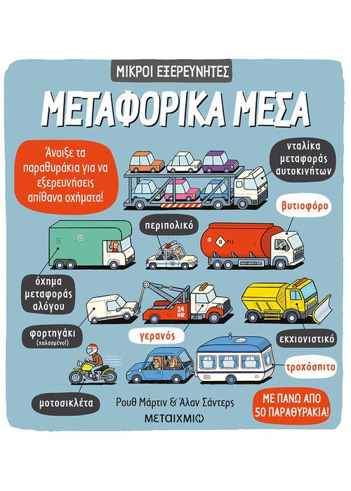 Καλούμε όλους τους Μικρούς Εξερευνητές! Ας ρίξουμε μια ματιά στον κόσμο των μετακινήσεων για να ανακαλύψουμε όλους τους θαυμαστούς τρόπους με τους οποίους ταξιδεύουμε. Άνοιξε τα παραθυράκια για να δεις ποιος κινείται και τι παίρνει μαζί του. Βάλε μπρος τις μηχανές και φύγαμε για εξερεύνηση! ΣΤΗ ΓΗ Ποδήλατα, αυτοκίνητα, λεωφορεία, τρένα, φορτηγά και άλλα πολλά! ΣΤΟΝ ΟΥΡΑΝΟ Αεροπλάνα, ελικόπτερα, αερόπλοια, αερόστατα και άλλα πολλά! ΣΤΗ ΘΑΛΑΣΣΑ Ταχύπλοα, αλιευτικά, κρουαζιερόπλοια και άλλα πολλά! ΜΕ ΠΑΡΑΘΥΡΑΚΙΑ ΓΙΑ ΝΑ ΕΞΕΡΕΥΝΗΣΕΙΣ ΑΠΙΘΑΝΑ ΟΧΗΜΑΤΑ ΜΕΣΑ ΚΙ ΕΞΩ!