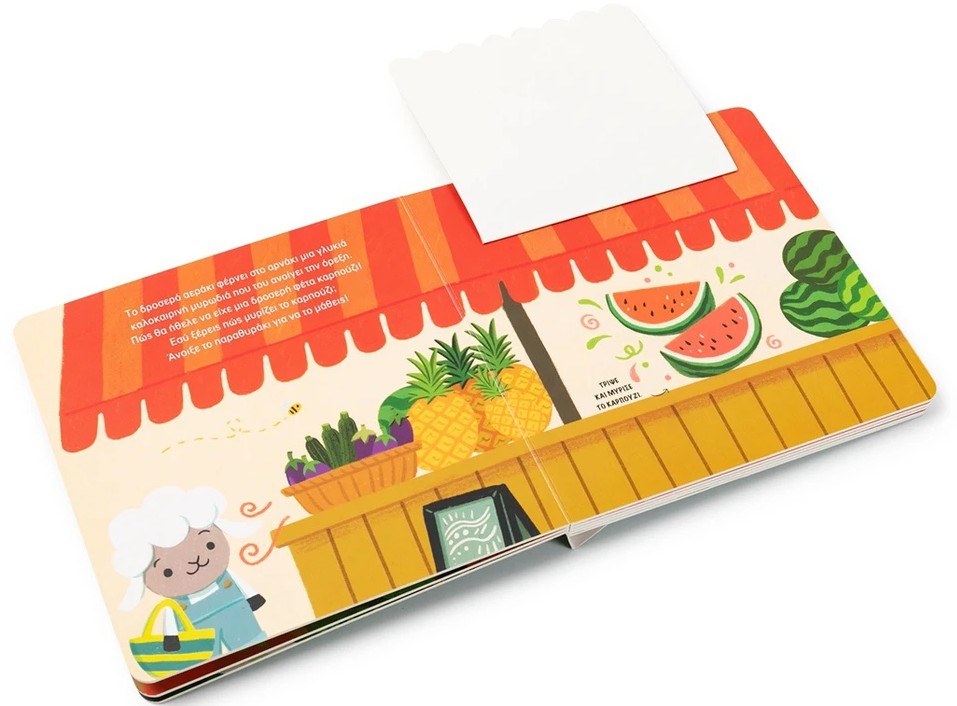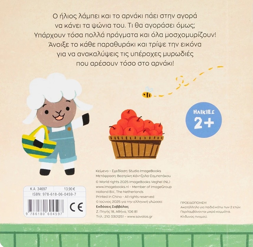 Ο ήλιος λάμπει και το αρνάκι πάει στην αγορά να κάνει τα ψώνια του. Τι θα αγοράσει όμως; Υπάρχουν τόσα πολλά πράγματα και όλα μοσχομυρίζουν! Άνοιξε το κάθε παραθυράκι και τρίψε την εικόνα για να ανακαλύψεις τις υπέροχες μυρωδιές που αρέσουν τόσο στο αρνάκι!