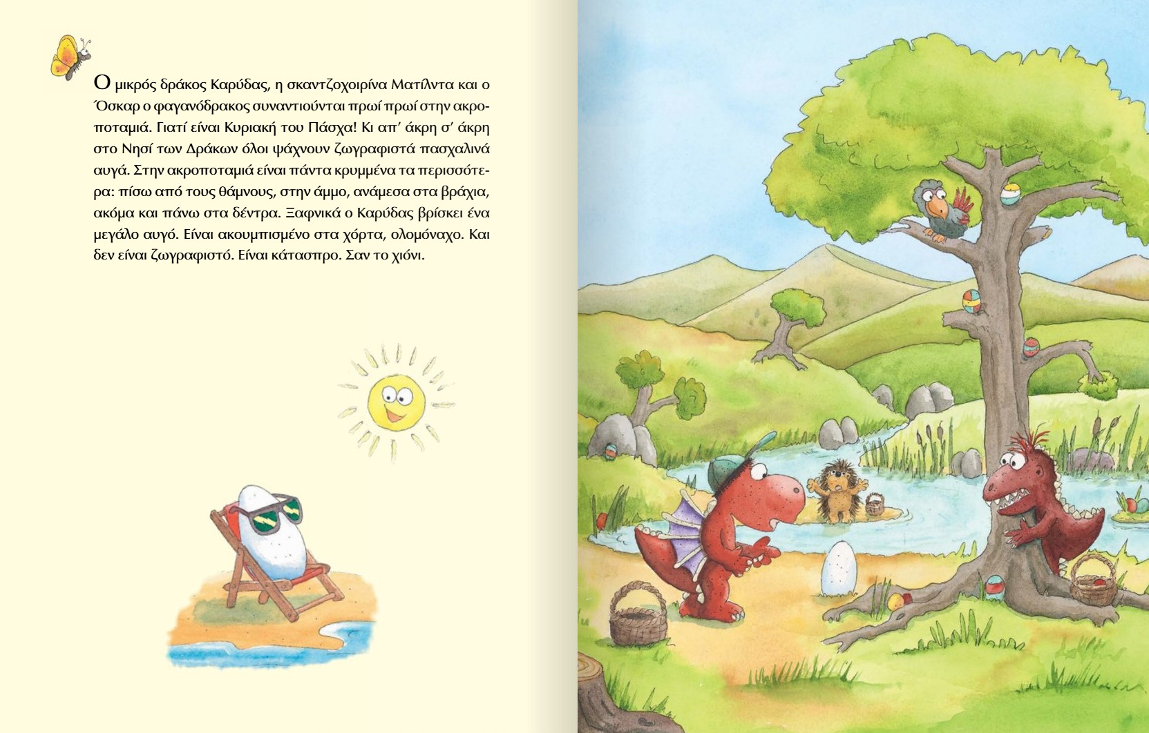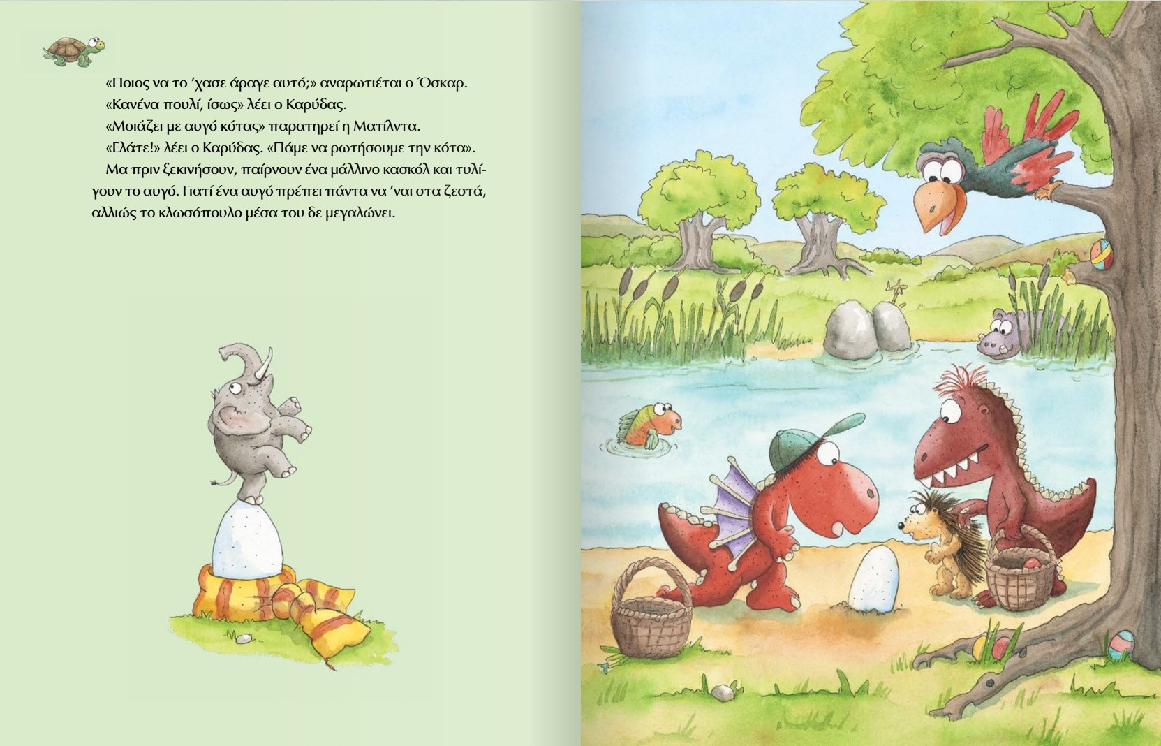 Τίνος είναι το αυγό; Ο μικρός δράκος Καρύδας, ο φαγανόδρακος Όσκαρ και η σκαντζοχοιρίνα Ματίλντα ψάχνουν πασχαλινά αυγά στην ακροποταμιά. Αλλά ανάμεσα στις φωλιές με τα πολύχρωμα βαμμένα αυγουλάκια οι τρεις φίλοι βρίσκουν ένα άσπρο άβαφτο αυγό, μόνο του. Τίνος είναι; Κοιτάνε δεξιά, κοιτάνε αριστερά, δε βλέπουν κανέναν. Το παίρνουν, λοιπόν, το τυλίγουν προσεκτικά μ’ ένα ζεστό κασκόλ κι αρχίζουν να ψάχνουν τους γονείς του μικρού που ακόμη δεν έχει σκάσει από το αυγό του…