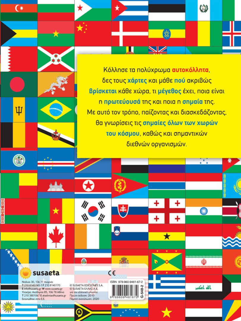 Κόλλησε τα πολύχρωμα αυτοκόλλητα, δες τους χάρτες και μάθε πού ακριβώς βρίσκεται κάθε χώρα, τι μέγεθος έχει, ποια είναι η πρωτεύουσά της και ποια η σημαία της. Με αυτό τον τρόπο, παίζοντας και διασκεδάζοντας, θα γνωρίσεις τις σημαίες όλων των χωρών του κόσμου, καθώς και σημαντικών διεθνών οργανισμών.