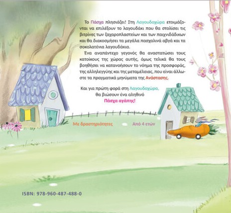 Το Πάσχα πλησιάζει! Στη Λαγουδοχώρα ετοιμάζονται να επιλέξουν το λαγουδάκι που θα στολίσει τις βιτρίνες των ζαχαροπλαστείων και των παιχνιδάδικων και θα διακοσμήσει τα μεγάλα πασχαλινά αβγά και τα σοκολατένια λαγουδάκια. Ένα αναπάντεχο γεγονός θα αναστατώσει τους κατοίκους της χώρας αυτής, όμως τελικά θα τους βοηθήσει να κατανοήσουν το νόημα της προσφοράς, της αλληλεγγύης και της μεταμέλειας.