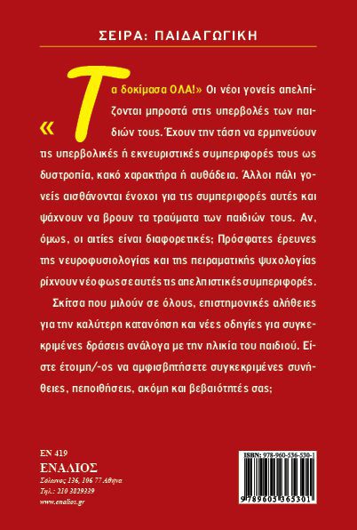 Τα δοκίμασα ΟΛΑ!» Οι νέοι γονείς απελπίζονται μπροστά στις υπερβολές των παιδιών τους. Έχουν την τάση να ερμηνεύουν τις υπερβολικές ή εκνευριστικές συμπεριφορές τους ως δυστροπία, κακό χαρακτήρα ή αυθάδεια. άλλοι πάλι γονείς αισθάνονται ένοχοι για τις συμπεριφορές αυτές και ψάχνουν να βρουν τα τραύματα των παιδιών τους. Αν, όμως, οι αιτίες είναι διαφορετικές; Πρόσφατες έρευνες της νευροφυσιολογίας και της πειραματικής ψυχολογίας ρίχνουν νέο φως σε αυτές τις απελπιστικές συμπεριφορές. Σκίτσα που μιλούν σε όλους, επιστημονικές αλήθειες για την καλύτερη κατανόηση και νέες οδηγίες για συγκεκριμένες δράσεις ανάλογα με την ηλικία του παιδιού. Είστε έτοιμη/-ος να αμφισβητήσετε συγκεκριμένες συνήθειες, πεποιθήσεις, ακόμη και βεβαιότητές σας;