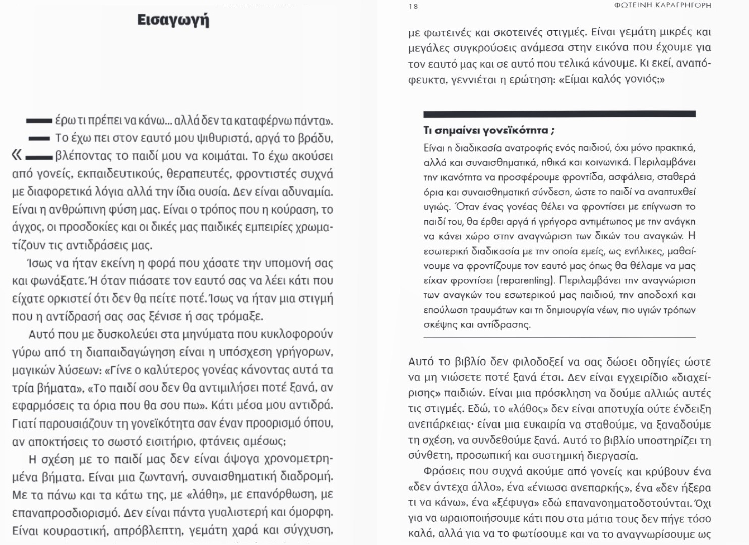 Αυτό το βιβλίο δεν περιέχει έτοιμες στρατηγικές που υπόσχονται «καλά παιδιά». Δεν είναι οδηγός «διαχείρισης» παιδιών. Είναι μια ζεστή υπενθύμιση ότι δεν είσαι μόνος ή μόνη στην προσπάθεια. Η Φωτεινή Καραγρηγόρη, εκπαιδευτικός, μητέρα, σύμβουλος γονέων και εκπαιδεύτρια Θετικής Διαπαιδαγώγησης, ανοίγει έναν χώρο συναισθηματικής παρουσίας, χωρίς φίλτρα τελειότητας. Τα «λάθη» δεν είναι αποτυχίες. Είναι ευκαιρίες για σύνδεση, μάθηση και εξέλιξη. Και το πιο σημαντικό δώρο που μπορούμε να προσφέρουμε στα παιδιά μας… είναι η αυθεντική μας παρουσία. Η γονεϊκότητα δεν είναι αγώνας για την καλύτερη επίδοση. Είναι αυθεντικότητα, όρια με αγάπη και τρυφερή παρουσία. Είναι σχέση. Είναι το θάρρος να επανέρχεσαι. Είναι το «μαζί», και ας μην είναι τέλειο. Ένα βιβλίο για να το ανοίγεις κάθε φορά που νομίζεις πως φταις για όλα.